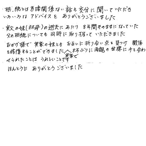 実父の妹(叔母)の逝去にあたり、8年間そのままになっていた父の相続についても同時に取り扱っていただきました。おかげ様で、実家の妹ともお互いに折り合い点を見つけ、関係を修復することができました。